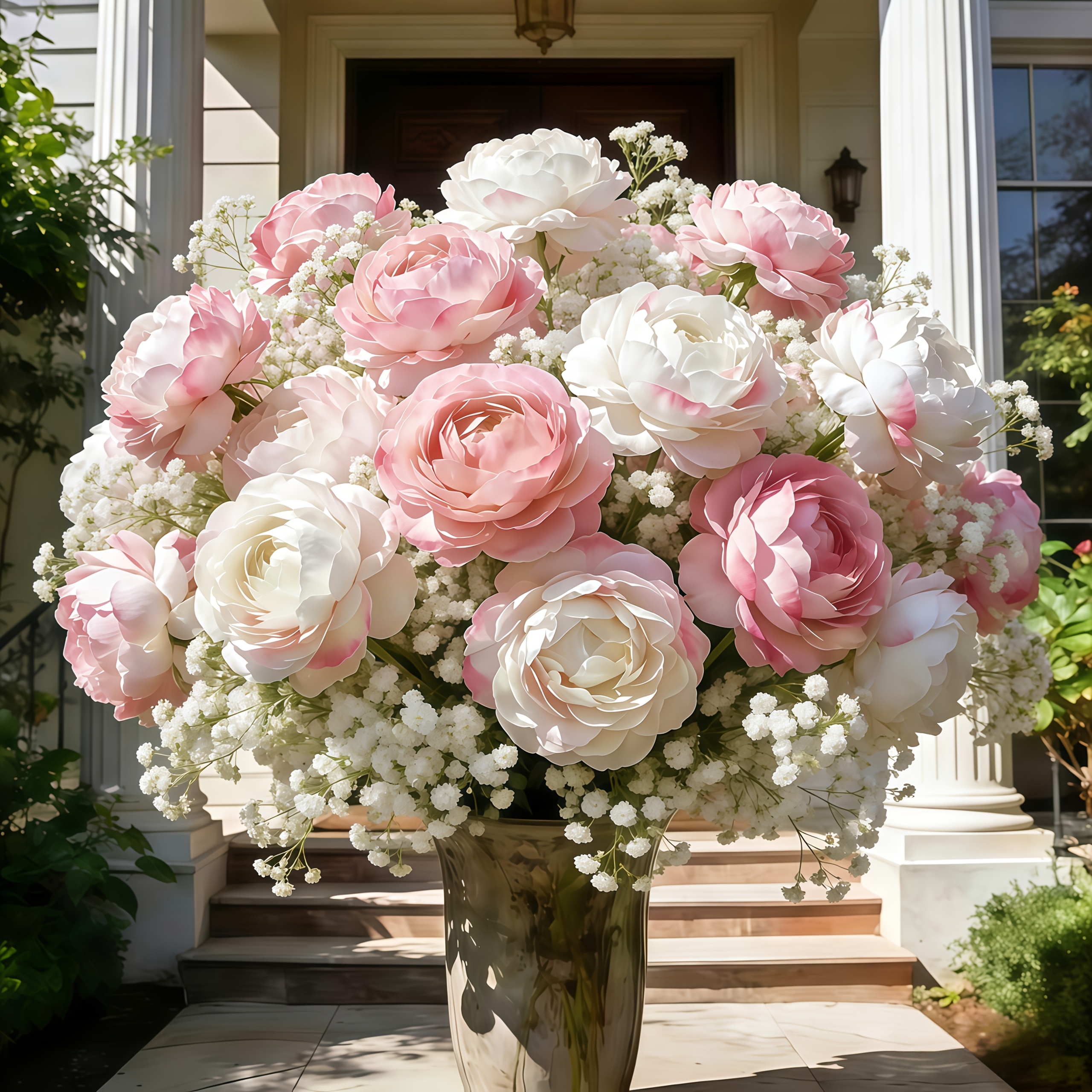22pcs White and Pink Peony Baby’s Breath Bouquet is designed to add decorative character to living rooms, bedrooms, shelves, desks, entryways, and gift displays. It works well as a floral accent, figurine, collectible piece, candle display, or seasonal styling item while remaining easy to place and maintain.