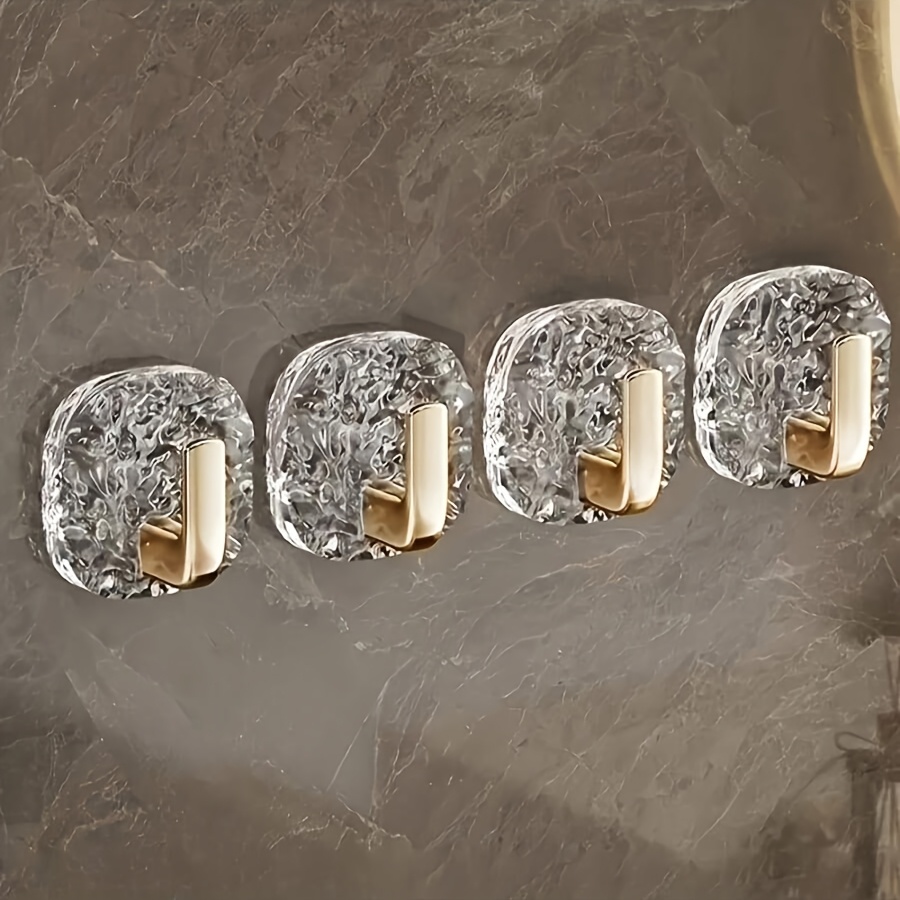 4-pack self-adhesive utility wall hooks for hanging loofahs, towels, brushes, or light everyday accessories in kitchens, bathrooms, and utility areas.