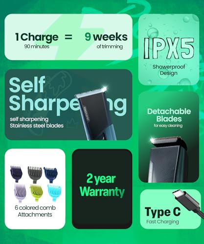 About this item 90 MIN NON-STOP USE: With a single charge of 1.5 hours, this trimmer for men offers 90 minutes of non-stop use, allowing you to trim for weeks without any hassle. TYPE C CHARGING: The trimmer for men features Type C charging, so you can conveniently charge your trimmer even with your phone charger. SELF-SHARPENING STAINLESS STEEL BLADES: This beard trimmer for men is equipped with self-sharpening stainless steel blades that remain sharper for longer than regular blades. Regularly oil your trimmer blades for optimal performance. DETACHABLE BLADES: The trimmer’s detachable blades make cleaning under water easy, ensuring that your hair trimmer for men stays hygienic and efficient. 6 ATTACHMENT COMBS FOR DIFFERENT BEARD LENGTHS: This all-in-one trimmer for men comes with 6 attachment combs for different beard lengths, ranging from 1-12mm in different color codes for easier identification.