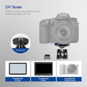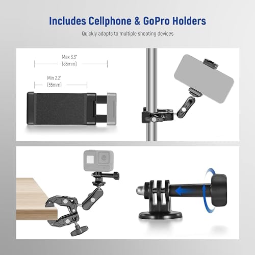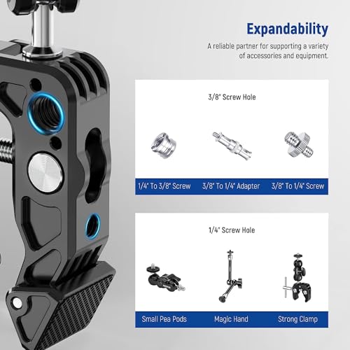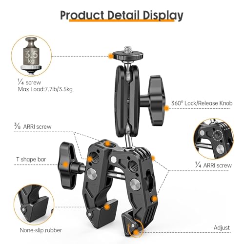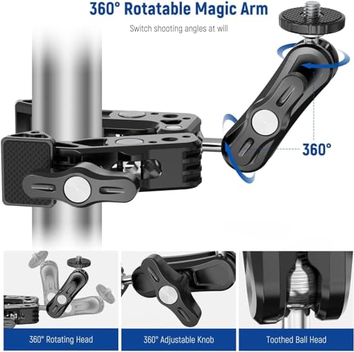 | Feature | 【Heavy Duty and Scratch Resistant】 Aluminum alloy and stainless steel metal hybrid material with precise CNC machining makes this phone and camera photography gear robust. Nonslip rubber pads on the clamp and the device mounting plate can increase stability and protect your equipment against scratches. Compatible with small rig magic arms compatible with manfrotto magic arms via the 1/4" threaded holes |