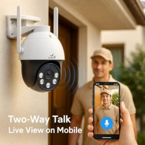 About this item 4G SIM Based Security Camera – No WiFi Needed Works independently using a 4G SIM card, perfect for homes, shops, farms, warehouses, construction sites and locations without broadband or Wi-Fi. 3MP Full HD Video with 355° Pan & 90° Tilt Control Remotely rotate the camera using mobile app for complete area coverage. Smooth pan-tilt motor with crystal-clear 3MP resolution for sharp face and object details. Color Night Vision & Smart Motion Detection Alerts Advanced IR + white LEDs deliver full-color night vision. Intelligent motion detection sends instant alerts to your smartphone for real-time security monitoring. Two-Way Talk with Live Mobile Viewing Built-in microphone and speaker allow you to talk and listen in real time through the mobile app — warn intruders, talk to visitors or guide delivery staff remotely. Supports Micro SD Card up to 256GB (Loop Recording) Store footage locally on SD card (not included). Automatic overwrite ensures continuous recording without manual deletion. Optional cloud storage supported. Indoor & Outdoor Use | Weatherproof Security Camera Rugged waterproof design built to withstand rain, dust and harsh weather. Ideal for outdoor gates, entrances, parking areas and indoor rooms. Works with Alexa & Google Assistant Control camera viewing via voice commands on Alexa or Google Assistant enabled devices. Smart home compatible for hands-free monitoring.