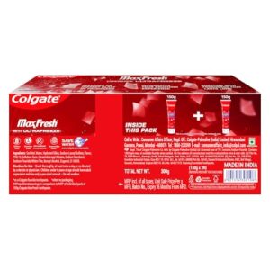 & Free ShippingAbout this item Good oral care habits keep your teeth and gums healthy, prevents tooth decay, gum disease & bad breath. To maintain good oral hygiene brush twice a day for 2 minutes each time, rinse with mouthwash for 30 seconds, and replace your toothbrush every 3 months Recommended usage: Brush twice a day for 2 minutes each time. Children below 6 years of age should have adult supervision Colgate is India’s most trusted oral care brand and certified by Indian Dental Association. This toothpaste is 100% Vegan, Sugar-free and Gluten free This red gel toothpaste contains unique cooling crystals that dissolve completely as you brush. Colgate Maxfresh gives you intense cooling and a burst of freshness Colgate Maxfresh toothpaste contains menthol that gives intense cooling and super freshness. It fights cavities, keeps germ build-up at bay and makes your teeth whiter on continuous use Colgate Maxfresh toothpaste contains menthol that gives intense cooling and super freshness. It fights cavities, keeps germ build-up at bay and makes your teeth whiter on continuous use