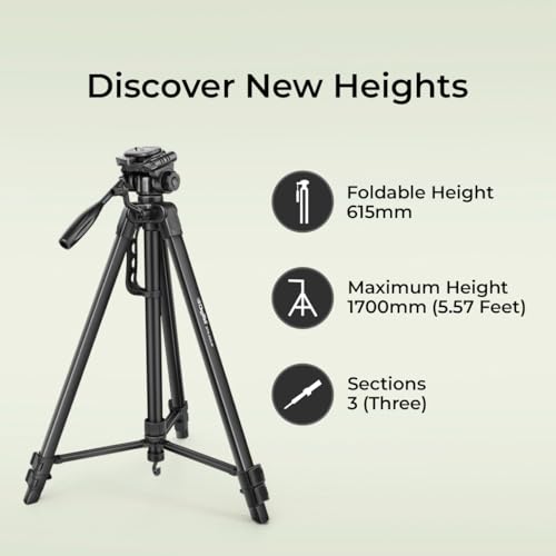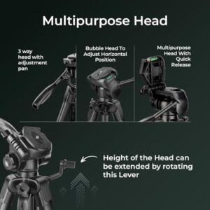 About this item Premium finish light weight professional tripod with adjustable height, multi level locking and steady rubberized legs Compatible with most video cameras, digital cameras, still cameras, GoPro devices and smartphones. Height Range: 615 mm – 1700 mm Multipurpose head with Quick Release helps ensure fast transitions between shots Built-in bubble head to adjust horizontal position and 3-way head with adjustable pan to allow for tilt and swivel motion with portrait or landscape options This professional tripod features multipurpose head for DV camera’s Convinient accessories hook to latch all your shoot belongings Recommended max load weight is 5kg for optimal performance