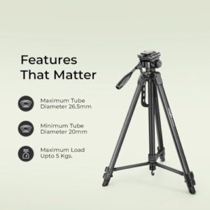 This tripod is a very good option for its price, especially for those who are looking for a good tripod on a budget. The maximum height of this tripod is around 170 cm (about 5.57 feet), which is enough for most photography and videography. It weighs around 1.2 kg, making it easy to carry anywhere. It is made of aluminum and has a good build quality. The rubber feet given in it give it a good grip on different surfaces, keeping it stable. It can lift a weight of up to 5 kg. So you can easily mount a DSLR, video camera, or smartphone on it. It has a 3-way head that lets you easily adjust your camera in portrait and landscape mode. Apart from this, it also has a bubble head that helps keep the tripod upright. It gets a quick release plate, so that you can quickly remove or attach the camera to the tripod. This tripod has multi-level locking and flip locks, so that you can easily set the height according to your need. A carry bag also comes with it. This tripod is quite good and durable for its price. It is especially a better option for beginner YouTubers and photographers. Overall, Digitek DTR 550 LW is a great option for those who want a multipurpose lightweight and sturdy tripod on a low budget, then you can go for it.