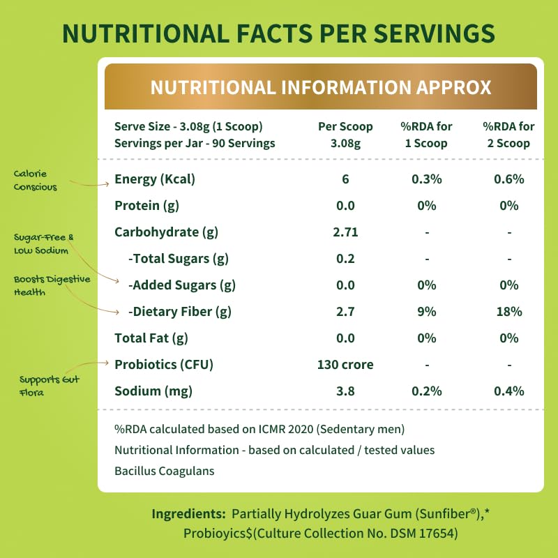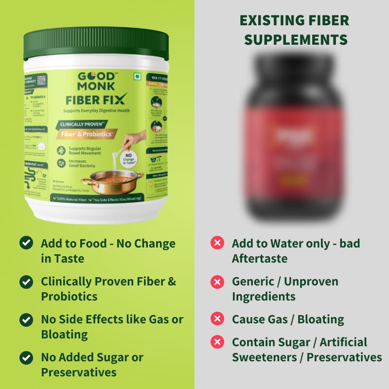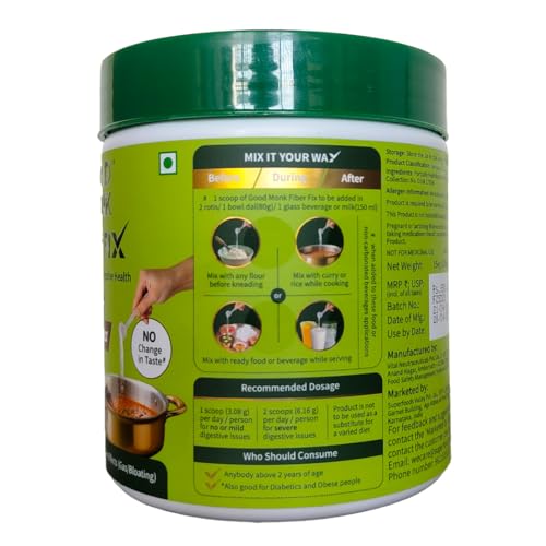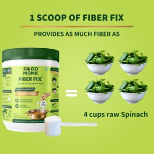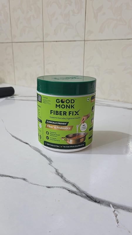 & Free ShippingAbout this item Clinically proven, everyday prebiotic soluble fiber supplement powder for digestive health with no side effects. Add one scoop to any Food before, during, or after cooking or add it to Beverages like Tea, Water or milk – no change in Taste! Made with 100% natural, clinically proven prebiotic fiber & probiotics for digestive health. Offers more soluble fiber per serving than spinach, oats, or other vegetables. Unlike other fiber powders, Good Monk Fiber Fix is tasteless, versatile, and free from laxative-like side effects. Boost overall health by pairing with Good Monk Family Nutrition Mix or Healthy 50+ Nutrition Mix for a complete wellness solution. Ideal for all family members above 2 years old, and especially beneficial for diabetics, the elderly, and those seeking weight management solutions