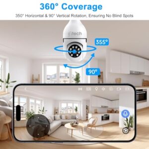 [360° Coverage (PTZ Technology)]: IFITech Bulb Security Camera offers 350° horizontal & 90° vertical rotation for panoramic coverage with minimal blind spots.