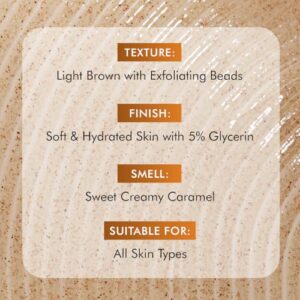 | Feature | JUST GOOD, NOTHING BAD : Caramel Crunch Exfoliating Body Wash is perfect for both women and men. It is PETA Certified, and free from artificial colours, fragrances, paraben, SLS, and all other toxic ingredients. It is also FDA-approved and dermatologically tested. |