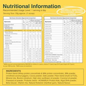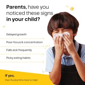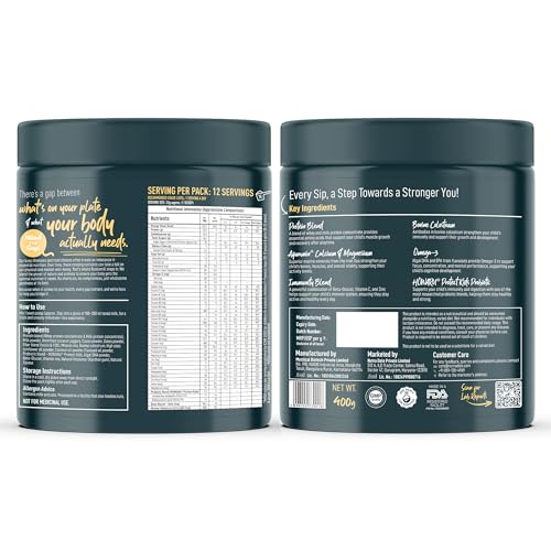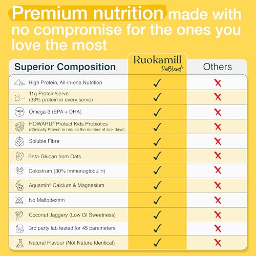 About this item INTRODUCING: Ruokamill ProBlend⁺ for kids is a daily nutrition mix crafted for growing kids (4–12 yrs). With 11g protein, Omega-3s (EPA & DHA), and HOWARU Protect Kids probiotics, it supports muscle growth, brain function, gut health, and immunity. Naturally sweetened with dates and coconut jaggery, no refined sugar. Enriched with 30+ nutrients including Aquamin calcium, Vitamin C, D3, and iron. Tasty Choco Rush flavour kids enjoy! NO REFINED SUGAR, NATURALLY SWEETENED: Sweetness comes from date powder and coconut jaggery, offering clean energy along with iron, and calcium, for overall vitality and well-being BRAIN & COGNITIVE SUPPORT WITH OMEGA-3: A smart blend of EPA from flaxseed and DHA from algae that supports focus, memory, and learning during key developmental years SUPPORTS GUT HEALTH WITH SYNBIOTICS: Includes inulin, FOS, and clinically studied HOWARU Protect Kids probiotics to aid digestion, improve nutrient absorption, and maintain a healthy gut microbiome BOOSTS IMMUNITY FROM WITHIN: Powered by bovine colostrum, beta-glucan, and probiotic strains to help strengthen your child’s natural defences and reduce the frequency of common colds and infections STRONGER AND TEETH: Fortified with Aquamin calcium and magnesium, sustainably sourced from red marine algae, known for high bioavailability to support bone growth and skeletal strength PACKED WITH 30+ NUTRIENTS: Includes key vitamins and minerals like Vitamin C, D3, B-complex, Vitamin A, iron, zinc, and magnesium to support immunity, energy levels, and overall development DELICIOUS CHOCO RUSH FLAVOUR: A rich chocolatey Choco Rush flavour made with the highest quality sourced cocoa that kids enjoy daily, no artificial sweeteners or synthetic ingredients, just wholesome milkshake like experience.