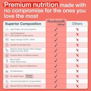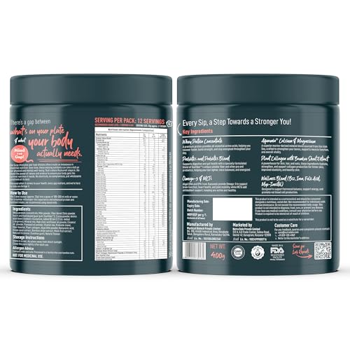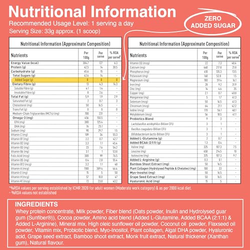 About this item Introducing: Ruokamill For Women Is A Thoughtfully Formulated Daily Nutrition Mix With 14g High-Quality Whey Protein Concentrate Per Serve, Added L-Glutamine, BCAAs, L-Arginine, Omega-3s, Aquamin Magnesium And Calcium, Plant Collagen, Hyaluronic Acid, And 30+ Essential Nutrients. Designed To Support Strength, Skin, Hair & Nails, Hormonal Balance, Gut Health, And Energy. Sweetness Derived From Monk Fruit Extract And Free From Added Sugar. Supports Muscle Health And Recovery: Delivers 14g Of Premium Whey Protein Along With Added L-Glutamine, BCAAs, And L-Arginine To Help Maintain Lean Muscle Mass, Assist In Post-Activity Recovery, And Support Daily Strength And Resilience. Healthier Skin, Hair & Nails: With Hyaluronic Acid, Plant Collagen, Bamboo Shoot Extract, Biotin, And Vitamins A, C & E, It Supports Skin Hydration, Elasticity, Stronger Nails, And Nourished Hair, Helping You Glow From Within. Hormonal Balance & Women’s Wellness: Powered By Myo-Inositol, B12, Iron, And Folic Acid, This Blend Supports RBC Formation, Emotional Balance, And Hormonal Wellness, Helping Reduce Symptoms Like Fatigue, Acne, And Mood Changes. Resilient Bones & Joint Support: Includes Aquamin Calcium And Magnesium From Red Algae, Plus Vitamin K, D3, Hyaluronic Acid, And Phosphorus To Support Bone Density, Flexibility, And Long-Term Joint Mobility. Better Gut Health & Smooth Digestion: A Thoughtful Blend Of Prebiotics (Inulin, Sunfiber) And Clinically Studied Probiotics—Lactobacillus Acidophilus (Enhances Nutrient Absorption), Bacillus Coagulans (Aids Regularity And Reduces Bloating), And Bifidobacterium Lactis (Strengthens The Gut Barrier And Supports Immune Function)—Works In Harmony To Promote Better Digestion, Ease Discomfort, And Keep Your Body Feeling Light And Nourished All Day. Cognitive Clarity & Brain Support: With Omega-3s And Key B-Complex Vitamins, This Formula Supports Mental Focus, Alertness, And Memory, Helping You Stay Sharp Through Demanding Routines.