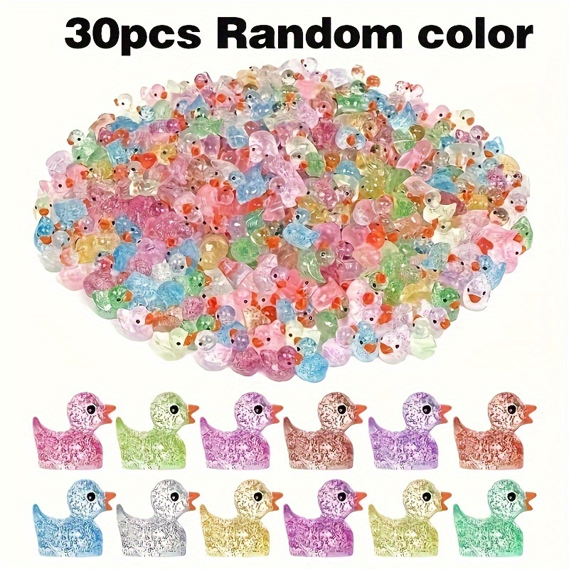 This assorted set of mini glitter resin duck figurines adds a fun decorative touch to small creative displays. The colorful pieces can be used for fairy gardens, dollhouse scenes, terrariums, tabletop decorations, and DIY craft projects.
