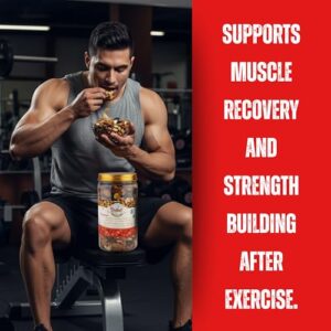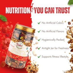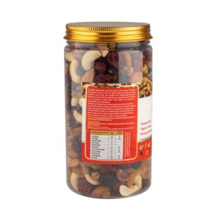 This is a Vegetarian product. About this item Premium mix of salted almonds, plain cashews, pistachio kernels, raisins & cranberries for rich taste & nutrition. 100% natural & freshly packed to preserve flavor, aroma & crunch for a healthy snacking experience. Rich in protein, fiber, vitamins, minerals & antioxidants for energy and overall wellness. Perfect for snacking, baking, salads, desserts, festive gifting & diet-friendly meal plans. Convenient, ready-to-eat healthy snack ideal for work, travel, workouts & family sharing.
