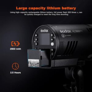 The Removal rechargeable lithium battery (14.4V / 2600mAh) Offers 320 Full Power Flashes with 0.01 to 1.5-second Recycling. 300Ws of Power Adjustable in 9 steps from 1/256 to 1/1
