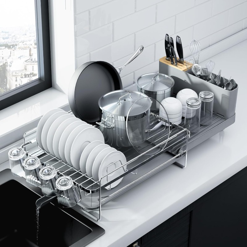 Kitsure Large Dish Drying Rack – Extendable Stainless Steel Anti-Rust Kitchen Counter Rack with Cutlery and Cup Holders 67. 8 x 32. 8 x 15. 0.0inch Sliver