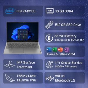 Lenovo V15 Intel Core i3 13th Gen (16GB RAM/512GB SSD/Windows 11 Home/Office 2024/Iron Grey) 15.6″ FHD (1920×1080) Antiglare 250 Nits Thin & Light Laptop/1Y Onsite/1.65 kg, 83CCA08KIN Amazon.in: Electronics