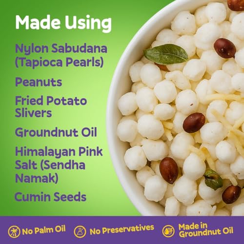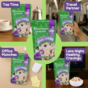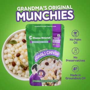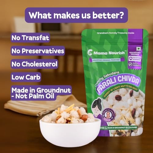 & Free ShippingThis is a Vegetarian product. About this item EXPERIENCE A NEW LEVEL OF CRUNCH – Mama Nourish’s farali chivda namkeen takes your snack game to a whole new level with a crunchy blend of sabudana pearls, crispy potato slivers, and peanuts roasted. Whether you’re looking for ready-to-eat snack, Navratri fast namkeen, tea-time indulgence, or on-the-go munching, this gluten free snacks healthy is a perfect fit for your lifestyle. Our healthy namkeen is a good solution for satisfying your taste buds without compromising on your health goals. UNMATCHED FLAVOR, NO GUILT – Mama Nourish Farali Chivda namkeen snacks are made with healthy oils (groundnut oil) and no preservatives, Farali sabudana namkeen is free from maida, and artificial additives & is a palm oil free snacks. It’s roasted using only groundnut oil and seasoned with cumin seeds for that mouthwatering flavor, this makes our upwas snacks as a cleaner, tastier snacks options. A CLEAN, HOMEMADE SNACK – Each bite of farali chiwda mixture is a burst of freshness and crunch, crafted with the blend of ingredients that are made in tradition. Mama Nourish’s Farali gluten free namkeen is made using techniques handed down through generations, ensuring that every handful delivers a taste of healthy snack . It’s a snack that feels like home, made with love from grandma. THE PERFECT ANYTIME SNACK – This Farali snacks mixture is perfect for those moments when you need a quick bite to curb your hunger. Its crunchy texture makes it an good partner for your afternoon chai or as a quick healthy food during your busy day. Whether you’re at home or on the go, it’s the ultimate snack for every occasion. A great choice for healthy snacks for adults, it’s also a perfect ready to eat food for travel or a tasty option for healthy namkeen snacks. TRADITIONAL FLAVOR IN EVERY BITE – Mama Nourish Chivda is crafted by our beloved Dadi, Dr. Ashlesha Parchure using clean ingredients and age-old techniques. No fillers, no artificial flavors just pure roasted chiwda. Mama Nourish’s Farali Mixture is the snack you can trust to provide both taste and health benefits. Perfect as sabudana namkeen for fast, these roasted snacks are a delicious, guilt-free treat. A great choice for kids snacks healthy, it’s a snack for the whole family. Perfect Festive Treat – Make your celebrations brighter with assorted namkeen packs that blend best taste and wholesome crunch. Rich for Diwali hampers, Navratri return gifts, or as thoughtful party favors, each pack brings happiness to loved ones with assorted namkeen packs crafted from premium ingredients for a true taste of India. Perfect for gifting, sharing, or enjoying anytime, this savory delight adds joy, richness, and convenience to every occasion.