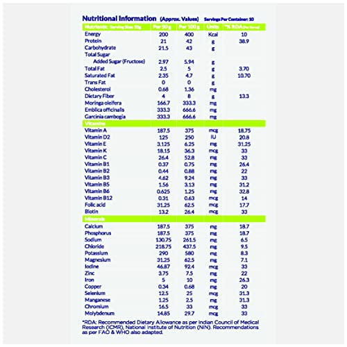 NUTRUTH High Protein Meal Replacement Slim Shake allows you to maintain strength and energy with its nutritious blend during your weight-loss journey. This shake can help to replace your meals effectively by saving you a significant amount of calories in a day. Replacing one of the major meals (Lunch/dinner) with NUTRUTH Slim shake provides 200 calories thus saving more than 600 calories per serving. This slim shake is a unique blend of more than 23 essential vitamins and minerals to take care of your daily nutrition quota which is good for heart and digestive health. Our Hi-Protein Slim Meal Shake is available in 5 delectable flavors, Kesar Badam, Pineapple, Chocolate Hazelnut, Turmeric Latte, and Strawberry. STORAGE CONDITIONS: Store in a cool and dry place. Protect away from direct sunlight. The Product is required to be stored out of reach of children. DIRECTIONS FOR USE: Take 2 scoops (50 g approx.) powder in a shaker/container and add 200 ml of water (approx.)
