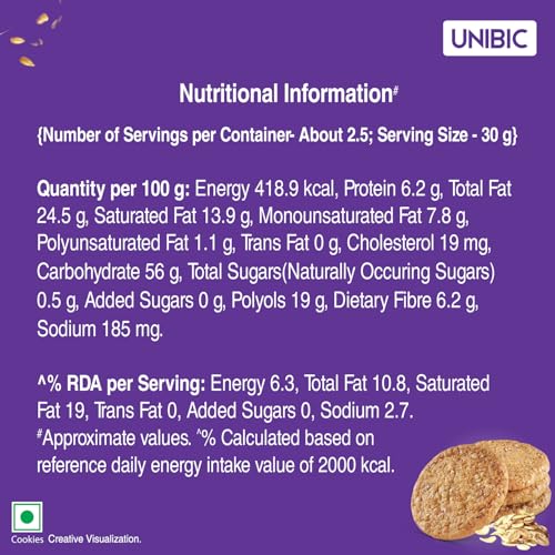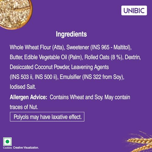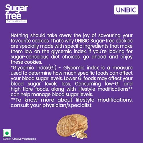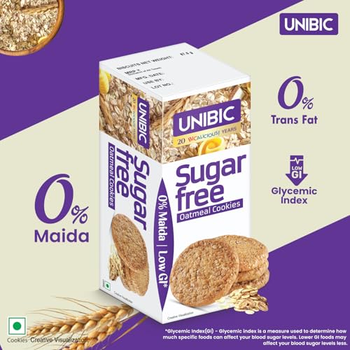 & Free ShippingThis is a Vegetarian product. About this item TRULY SUGAR-FREE – UNIBIC presents a snack perfect for diabetic people. It has maltitol that sweetens the cookie just enough to make it palatable. NO ARTIFICIAL INGREDIENTS – The delectable taste of the UNIBIC sugar free biscuits comes from carefully selected premium natural ingredients. A HEALTHY SNACK – UNIBIC sugar free cookies are trans-fat-free and can be enjoyed by any health-conscious individual who needs a healthy munch. VEGETARIAN OPTION – The UNIBIC sugar free biscuits are a snack which everyone can enjoy as they are healthy and made from vegetarian ingredients. PERFECT CRUNCH – Experience the feeling of biting on a perfectly baked sugar free cookie. The flavoursome taste can keep you hooked on until you finish the pack. special_ingredients:Refined Wheat Flour, Sweetener (E965 – Maltitol, E955 – Sucralose), Butter, Edible Vegetable Oil (Palm), Rolled Oats (8%), Dextrin, Desiccated Coconut Powder, Leavening Agents (E503 ii, E500 ii), Emulsifier (E322 From Soya), Sal. item_firmness_description:firm